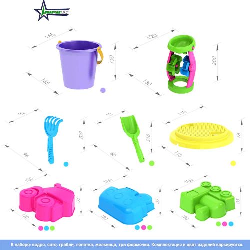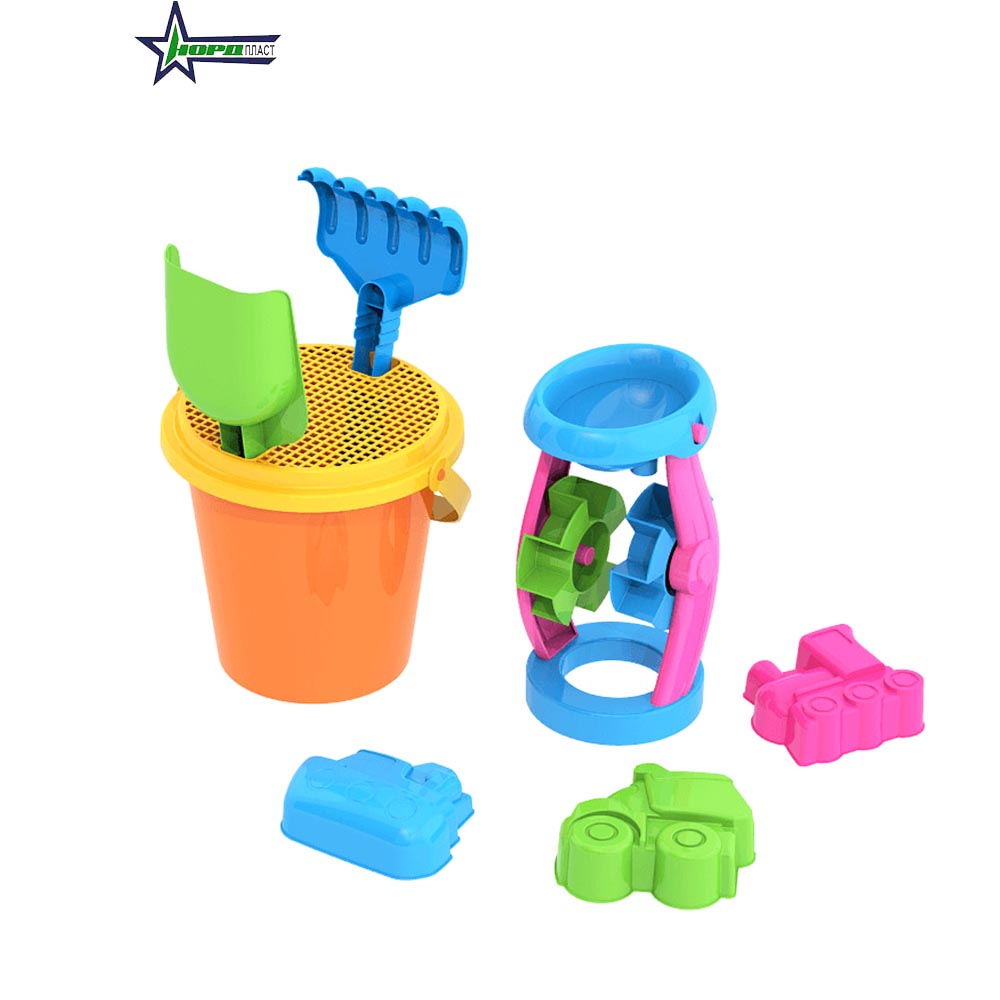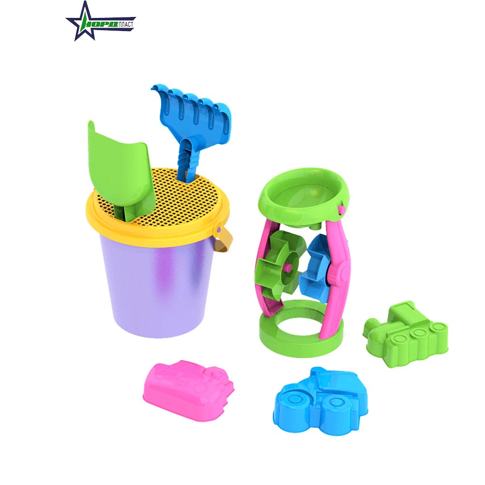 НАБОР ДЛЯ ПЕСКА № 20 (ВЕДРО, СИТО, МЕЛЬНИЦА, СОВОК, ГРАБЛИ, 2 ФОРМОЧКИ "ТРАНСПОРТ")