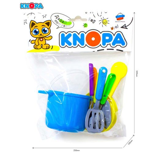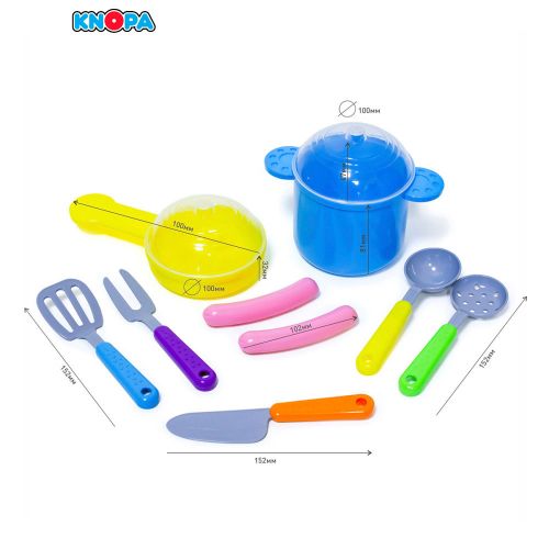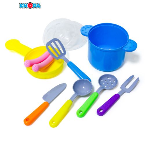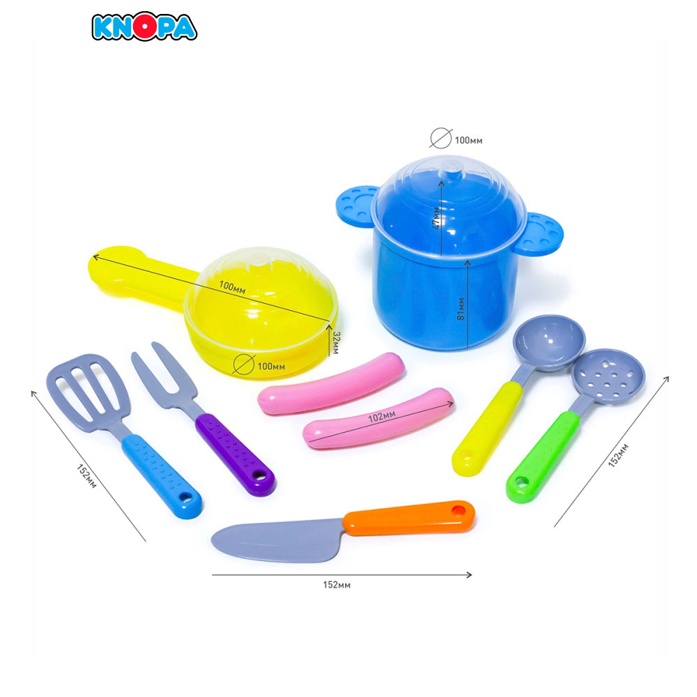 Набор посуды «Готовлю ужин» - это увлекательный игрушечный набор детской посуды, при помощи которого ваши детки смогут создать настоящую чайную церемонию. В игровом комплекте малыши найдут кастрюлю с крышкой, сковороду с крышкой, половник, шумовку, вилку для мяса, лопаточку, нож кухонный, 2 сосиски. Эта сюжетно-ролевая игра поможет вашим детям организовать забавную чайную церемонию, угощая сладостями своих сверстников или кукол. Все предметы набора изготовлены из безопасного пластика и упакованы в пакет с карточкой-ручкой.